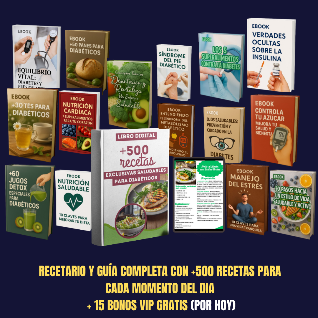 Recibirás el acceso al libro 500 RECETAS PARA DIABÉTICOS y todos sus bonos directamente en tu correo electrónico.